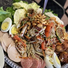 I am a kow poon (vermicelli noodle) lover. The coconut curry soup is so savory and just the right amount of sweetness. The crying tiger meat dish really made me cry from such happiness coming from the goodness of it Gotta ger that papaya platter. We got the jackpot platter and yes we hit the jackpot! So much varities of side meat like fermented sour pork, vietnamese like pork ham, chicken and so much more and of course combine it with sticky rice! Young fresh coconut was so sweet and refreshing for the heat. Service was excellent and quick. Went on a sunday around 5pm and was greeted with friendly faces. The interior is beautiful with a mural like painting of Lao Thai representation. To the right theres a small stage party like room. Great food and service.
