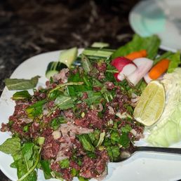 The food are good. There are some hit and miss dishes. The host is friendly and by the restaurant that ambience looks really nice, clean, relax with live music and a big screen TV enjoy some music while eating Lao-Thai food. The outside and parking lot looks a little creepy but inside not bad. I can say some dishes are authentic Lao whereas are some are mixture-modern, not that authentic?